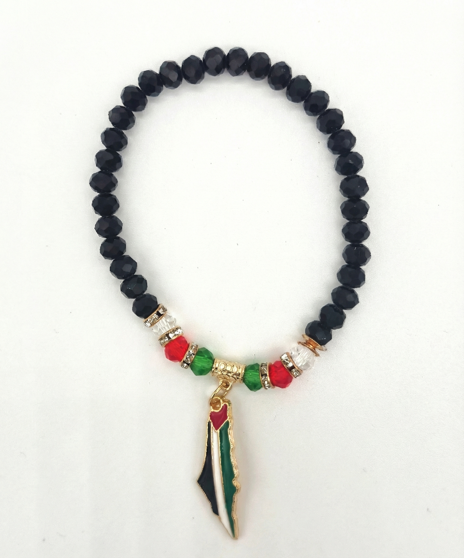 Featuring high-quality black faceted crystal beads, the bracelet is accented with red, green, white, and gold detail beadsthat reflect the colours of the Palestinian flag. At the center hangs a beautiful gold outlined Palestine map charm, filled with the flag’s colours for a bold and symbolic finish.