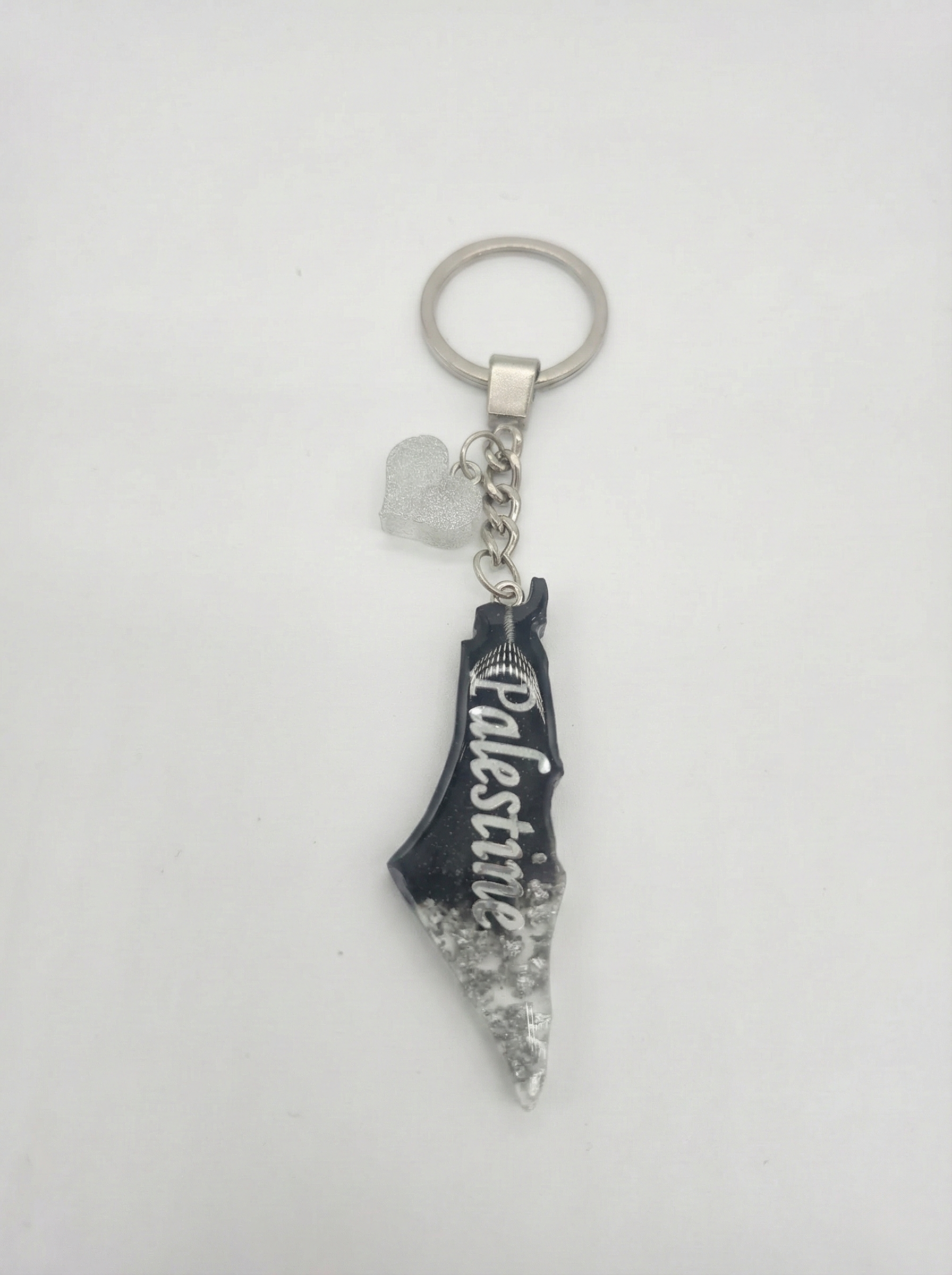 Stylish, modern, and meaningful. This Palestine Resin Keychain features a sleek black resin map accented with shimmering silver flakes for a clean, bold finish. The silver “Palestine” script and matching glitter heart charm complete the look with a polished touch.