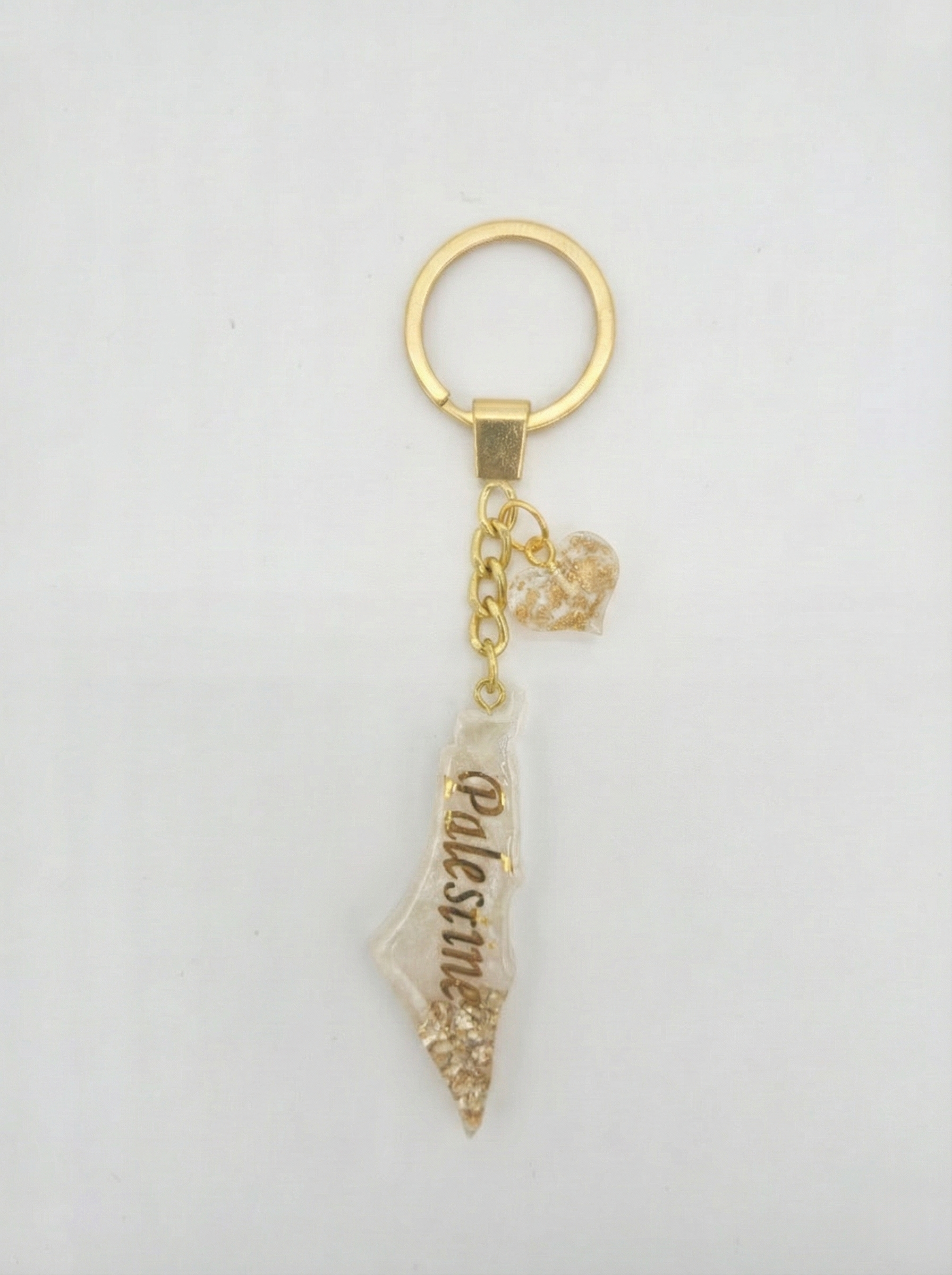 Elegant, meaningful, and beautifully crafted. This Palestine Resin Keychain features a sleek white resin map of Palestine, accented with shimmering gold flakes for a luxurious finish. The gold “Palestine” script and matching heart charm complete the look with a touch of warmth and sentiment.